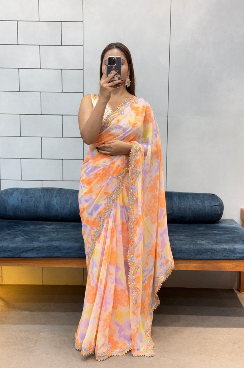Step into elegance with this vibrant and airy saree, crafted to bring effortless grace to your wardrobe.