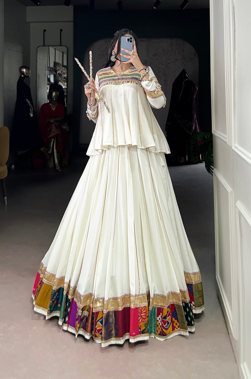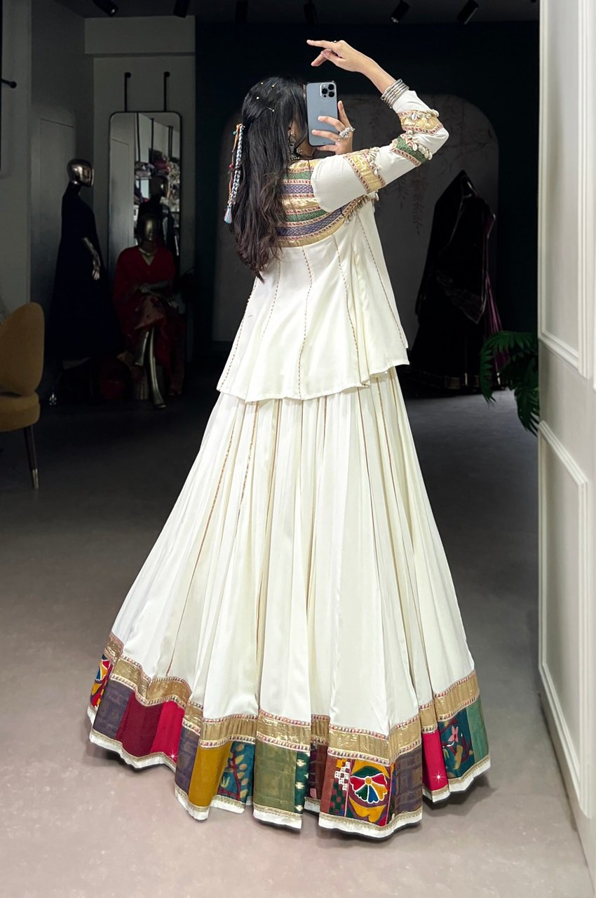 Gracefully designed in a soft white hue, this ethnic wear lehenga choli features traditional mirror work and vibrant multicolor patch borders. Perfect for Navratri festivities, it blends elegance with cultural charm for a standout look.